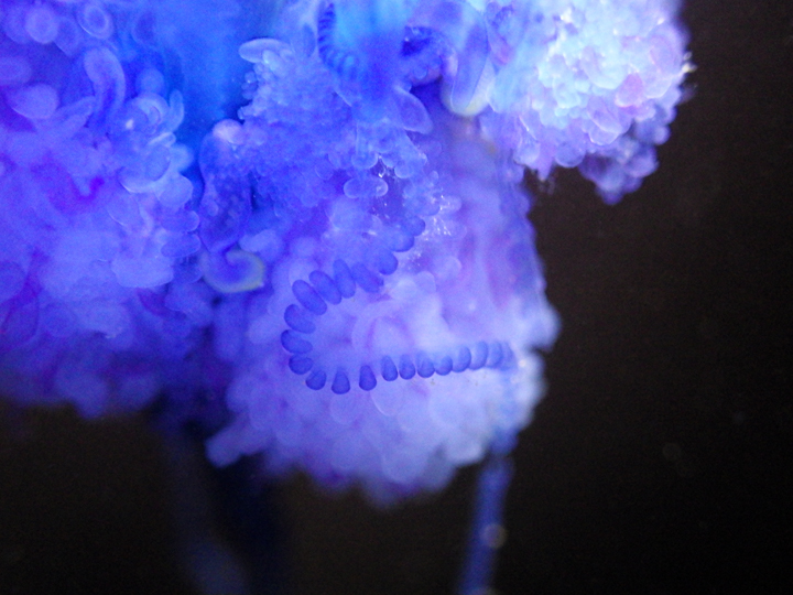 These are the stinging tentacles of a small Indo-Pacific Portuguese Man of War that washed into shallow water during rough weather. Sometimes during storms, thousands of them get beached by the wind and waves. Despite being poisonous, they are quite beautiful. They are semi-transparent, and often range from light blue to dark purple. They live on the surface of the water with an inflated sail above the water and long underwater tentacles that sting and immobilize small prey. Their poison is a rather nasty neurotoxin. Photographing them was challenging because their tentacles are constantly moving in the water and I was trying not to get stung.