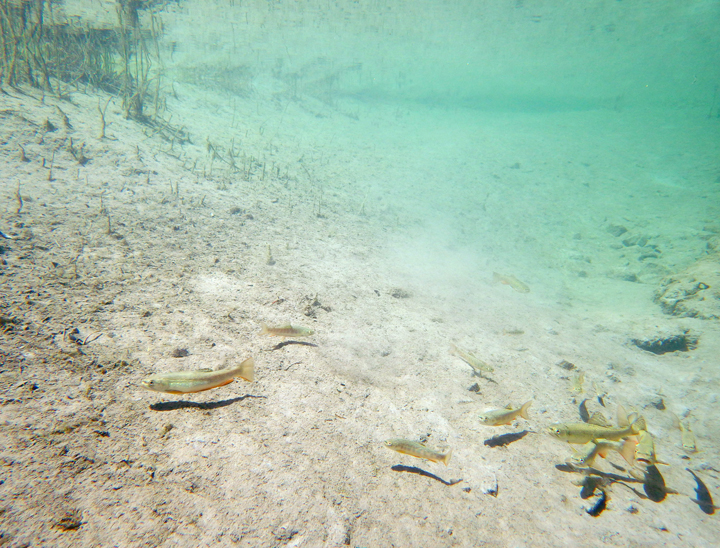 These are native cutthroat trout that I photographed near an alpine lake in the Sierra Nevada mountains. The lake is at an elevation of about 10,000 ft. For about 2 miles upstream of the lake was a beautiful wetland of meandering streams and small crystal clear ponds. Many of the Sierra alpine lakes are slowly fed clean water all summer from winter snow melt. The water in many of the lakes is super clear and quite cold.