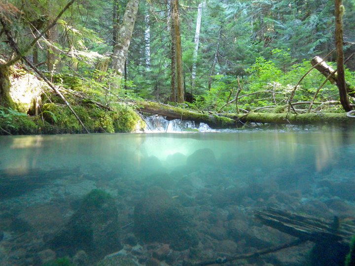 I took this photograph earlier this week in Oregon. It’s a little tricky, in an image like this, to get the exposure right above and below the water at the same time. I had the camera in the water with the water surface right in the middle of the lens. The water level is also constantly changing as the water flows around the camera, so there is lot of trial and error involved with getting a nice perspective both above and below. I like the way the light on the bubble filled waterfall made the water glow.