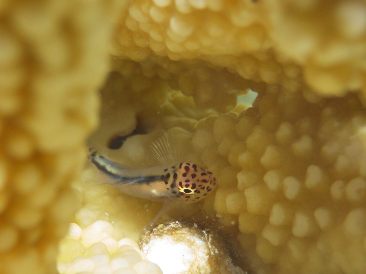 This is a macro photograph that I took in the south side of Heron Island in the Great Barrier Reef. I was really pleased to find all the crevices of the coral filled with small young fish and tiny creatures. This little fish is probably only about half an inch long. The amount of life in the reef is really not immediately apparent at first glance.