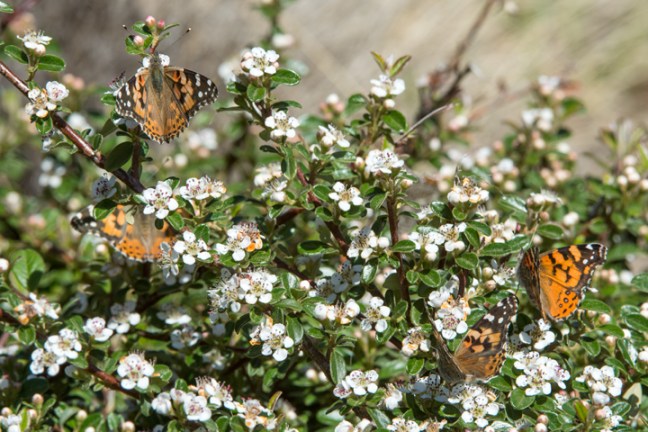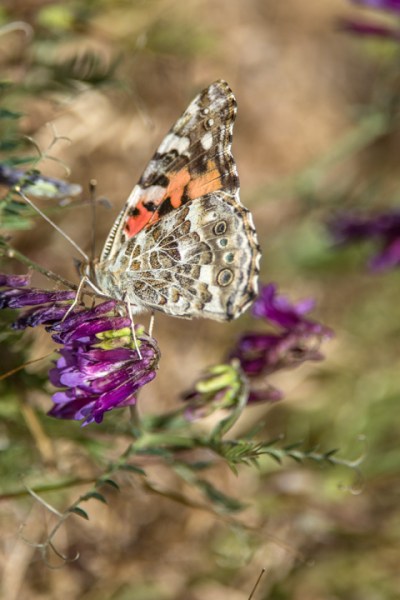 In the last few weeks, thousands of Painted Lady Butterflies have started migrating from Mexico to the Pacific Northwest through Central California. I’ve been enjoying watching them come through our area. They are quite pretty with orange/black/white wing tops and a delicate under wing with a lot of fine detail.