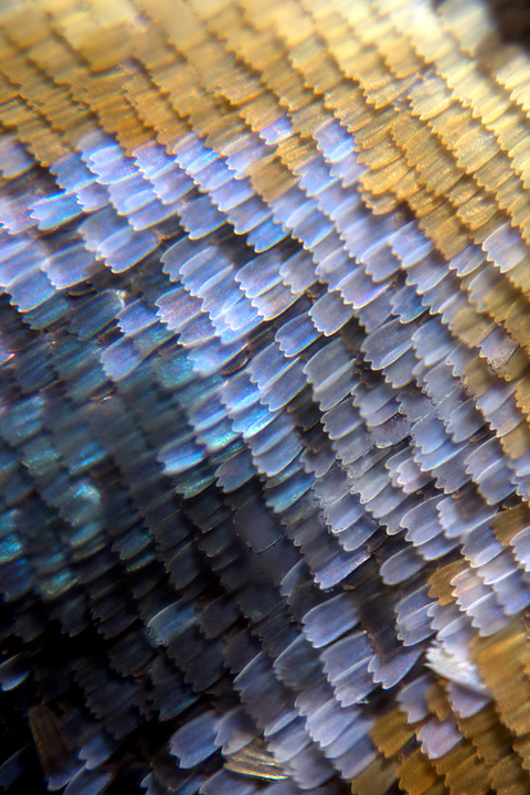 This is a closeup image that I took of a Painted Lady Butterfly wing using a microscope (300x magnification). It’s impressive that such a delicate wing isn’t damaged when they fly. I like how the blue colors that normally seem iridescent are actually partially transparent when magnified.