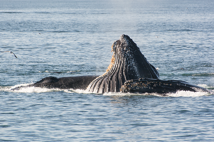 I took this photograph off the coast of the Monterey peninsula. Three humpback whales just surfaced and are sinking back into the water after lunge feeding. In this case, the whales would come up as a group directly under a school of sardines. Each of the whales would take a large gulp of sardine filled water at the surface and then slowly squeeze the water through their baleen as they sank back into the water. At the time, there were also a lot of sea lions feeding in the area. When the whales where about the come up, the sea lions would scatter in all directions to avoid the surfacing whales.