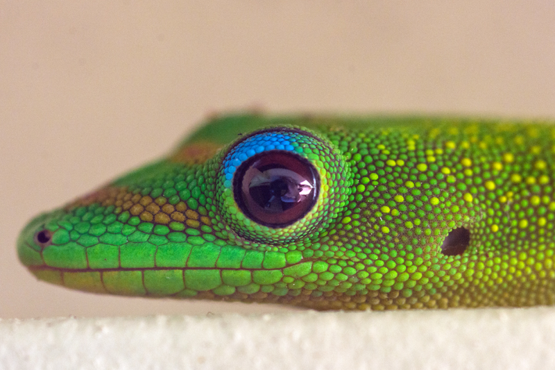 I love the color of Gold Dust Day Geckos. They are native to Madagascar, but they are now very common on many Pacific Islands. They have a nice, mild personally and love to eat most types of sweet fruit and even honey. It is also interesting that they don’t have eyelids, and therefore they can’t blink. When they need to clean their eyes, you will sometimes see them licking their eyes. It’s neat how many different permutations there are in nature.
