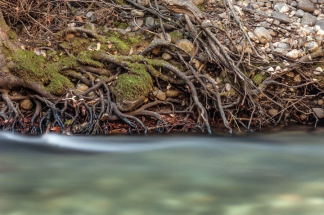 I took this picture of a forest stream bank along the coast in central California. I like the image because it has a nice contrast between the complicated detail of the static stream bank and the almost featureless fast-moving water. I’ve taken photographs at this particular place quite a few times over the years. This particular stretch of stream has a nice feel to it.