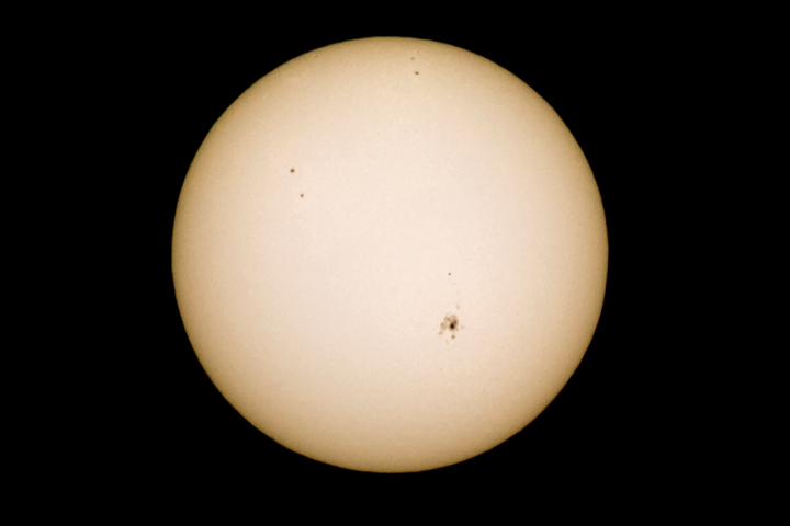 2-This is the sun partially eclipsed this evening. You can see that the large sun spots are still there, but they have moved and changed shape and size. You can see that this image is not as sharp as image #1 because it was shot late in the day at a lower angle (through more atmosphere).