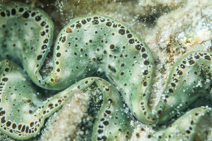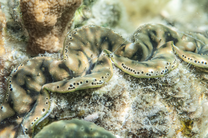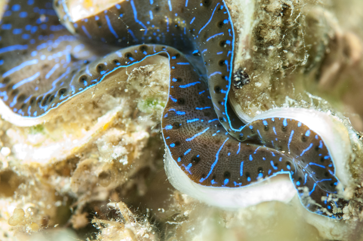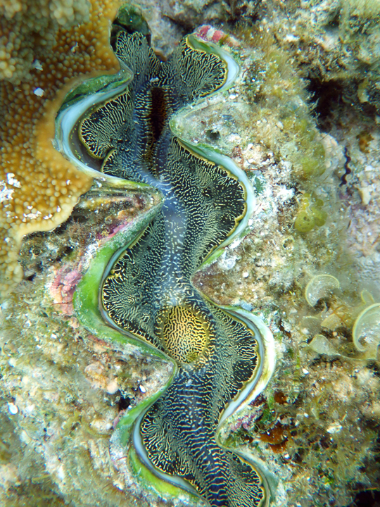 These are Giant Clams that I photographed on the Great Barrier Reef. These Giant Clams live in warm shallow waters in the south pacific. They can grow quite large (several feet), but most of these are less than a foot across. They are filter feeders and are open most of the day. They close very quickly if startled or if a shadow moves over them.